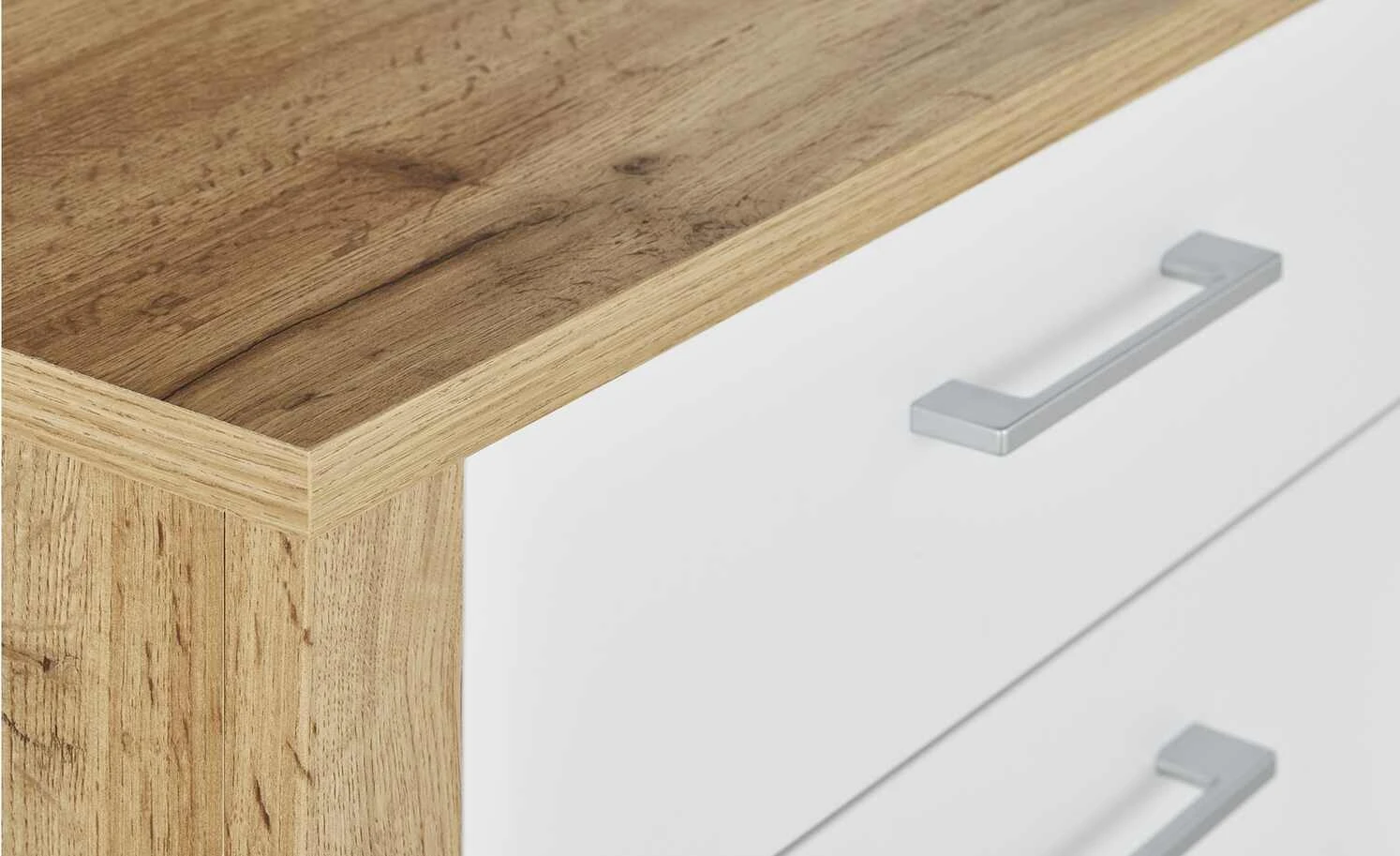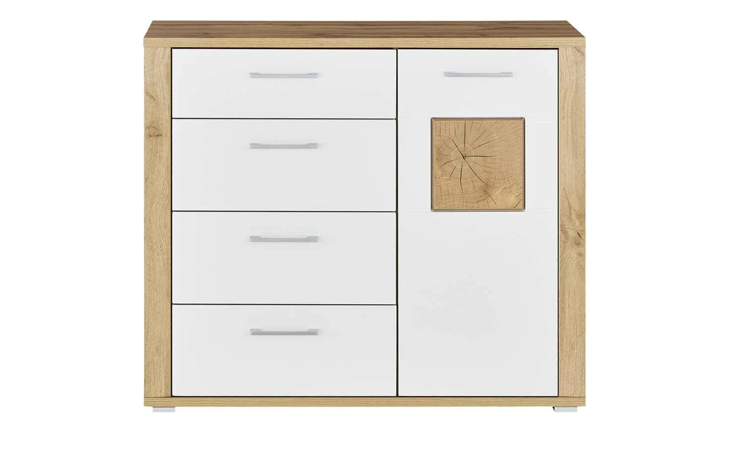 Modernes Design lässt sich wunderbar mit natürlichen Akzenten kombinieren. So wie bei der Kommode Yambio von uno. Die geradlinige Linienführung und weiße Front wirken modern, während sich der Korpus in rustikaler Eiche Altholz (Nachbildung) absetzt. Ein besonders interessanter Eyecatcher ist die Frontabsetzung in Hirnholz (Nachbildung). Sie greift die Optik eines aufgeschnittenen Baumstammes auf, bei der Sie die Jahresringe erkennen können. Yambio ist mit vier Schubladen und einer Tür ausgestattet. Alle vier Schübe verfügen über einen sanft schließenden Selbsteinzug, die Tür ist mit einer Soft-Close-Ausstattung versehen.