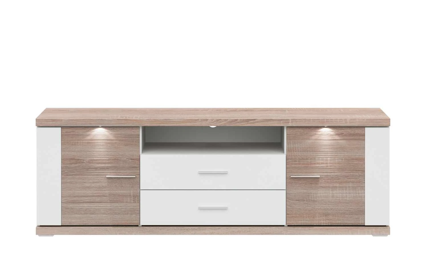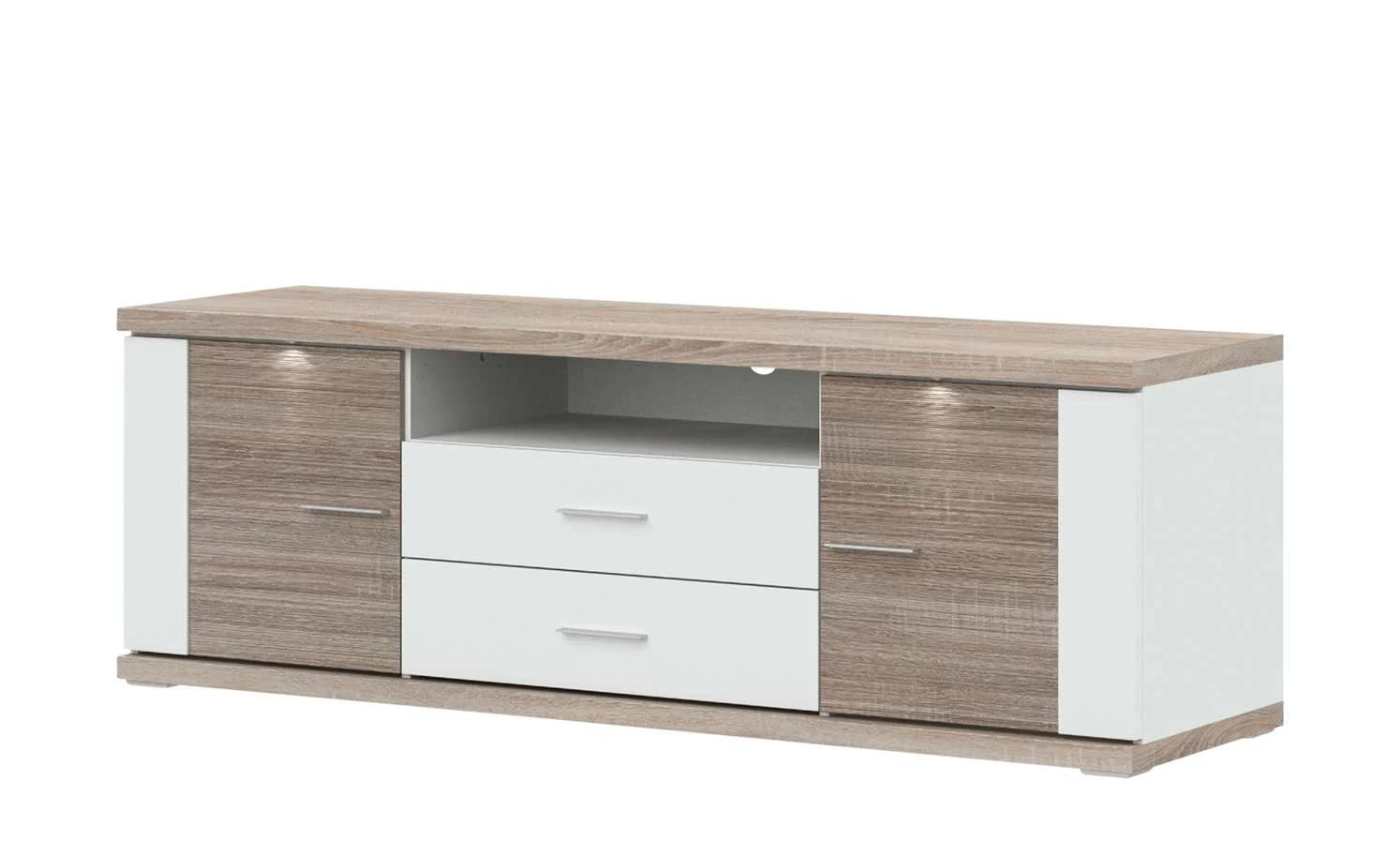 Für Ihren Fernseher empfehlen wir das TV-Lowboard Titan von uno. Es hat eine 180 cm breite, stabile Stellfläche. Mittig darunter befindet sich ein Gerätefach mit Kabeldurchlass in der Rückwand. Für Stauraum sorgen die insgesamt vier Fächer hinter den Türen und die beiden mittigen Schubladen. Titan fällt durch sein Kontrastdesign in Weiß und Eiche sägerau (Nachbildung) ins Auge. Während die weißen Frontflächen hochglänzend sind, setzten sich die graphitfarbenen Frontakzente durch ihre geschroppte Oberfläche ab. Damit sie noch besser zur Geltung kommt, ist Titan mit zwei LED-Spots ausgestattet.