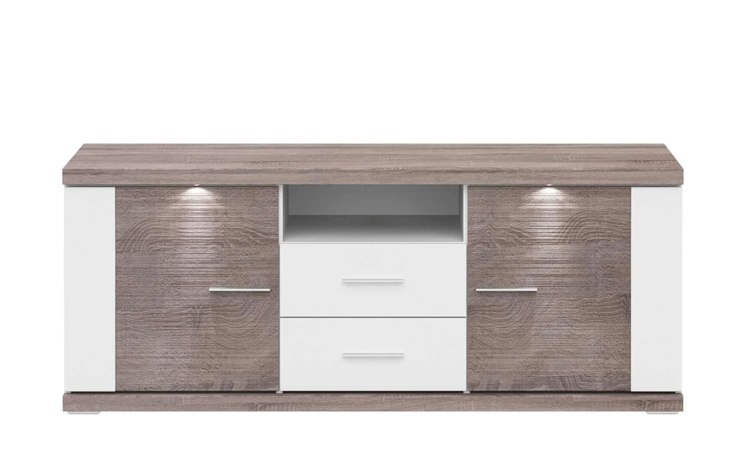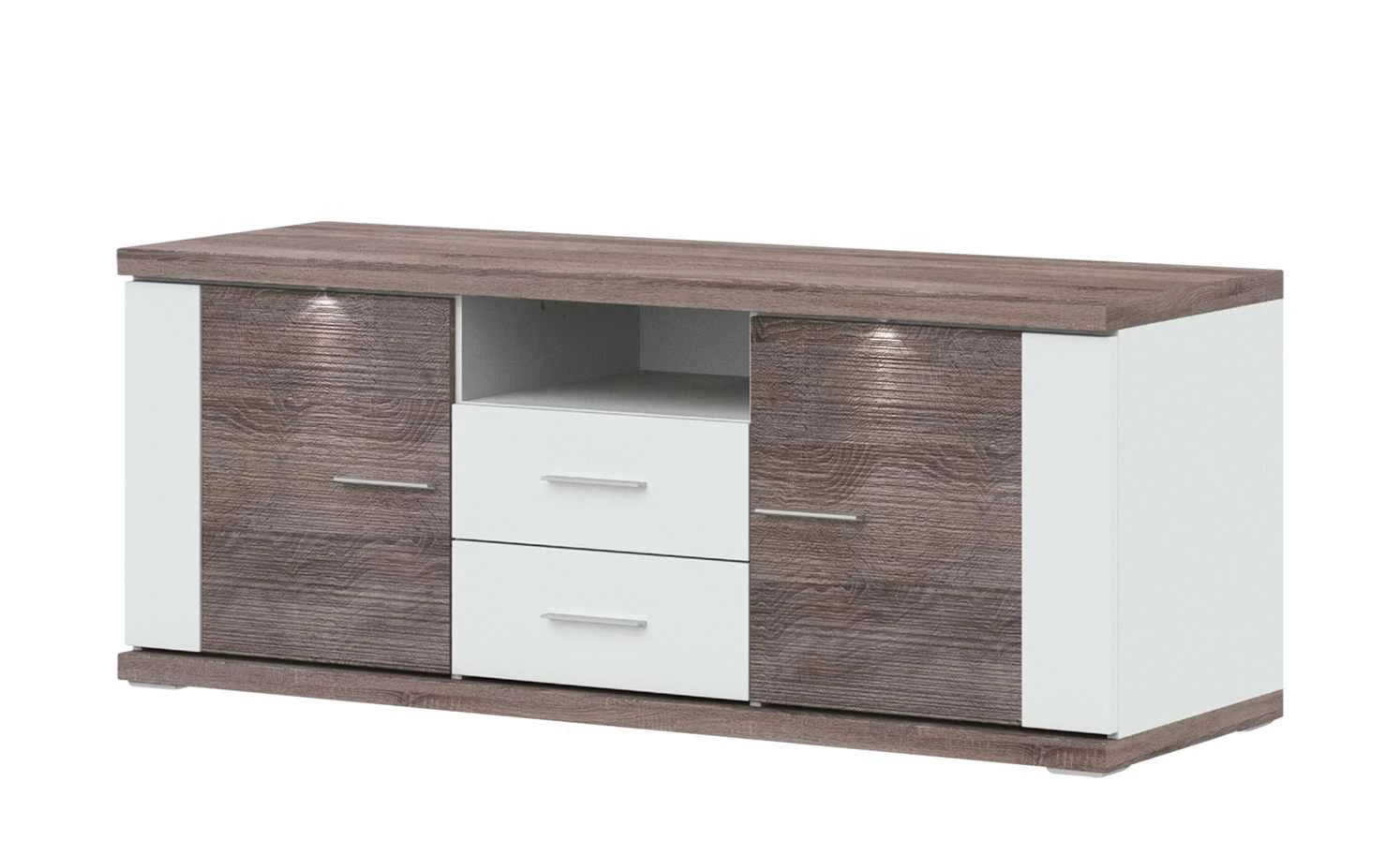 Bringen Sie noch mehr Stauraum in Ihr Wohnzimmer – und zwar mit dem Lowboard Titan von uno. Links und rechts ist jeweils eine Tür mit je zwei Fächern zu finden. Mittig können Sie ein offenes Fach und zwei Schubladen nutzen. Titan ist zweifarbig gestaltet: Ein schönes Weiß wird mit Eiche Trüffel (Nachbildung) kombiniert. An den Türfronten wird das dunkle Dekor durch eine geriffelte Optik akzentuiert. Die weißen Frontflächen haben ein edles Hochglanzfinish. Durch die LED-Spots an der Front wird Titan perfekt ausgeleuchtet.