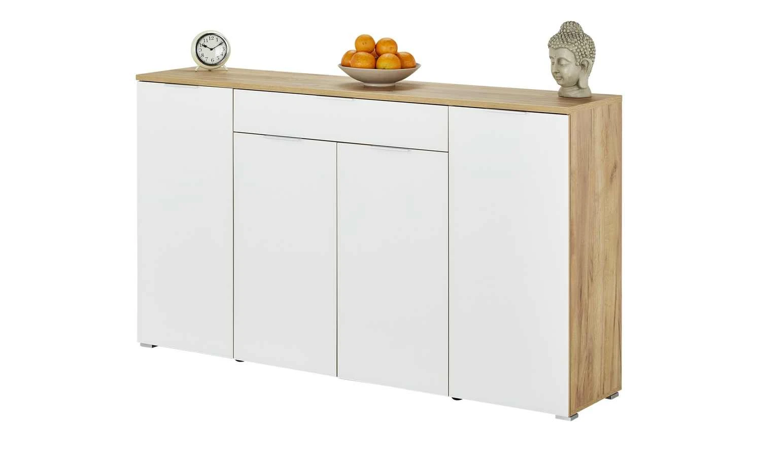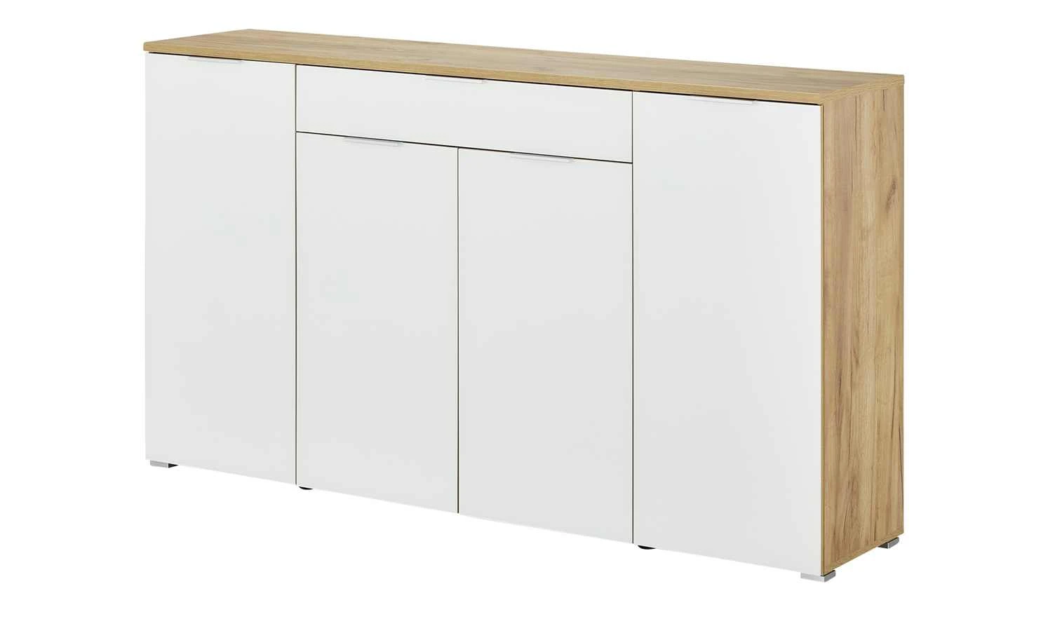 Stylisches Design und Funktionalität vereinen sich in der Kommode Bent von uno. Der Korpus ist in rustikaler Navarra Eiche (Nachbildung) gehalten. Die weiße Front setzt sich davon dekorativ ab. Sie ist aus Glas und hat einen leichten Glanz. Er hebt das Weiß hervor. Das Sicherheitsglas ist robust und kratzerunempfindlich – so wie auch der Korpus. Er ist mit strapazierfähigem Melamin beschichtet. Bent verfügt über eine Schublade und vier Türen. Dahinter befinden sich acht Fächer mit jeder Menge Stauraum.