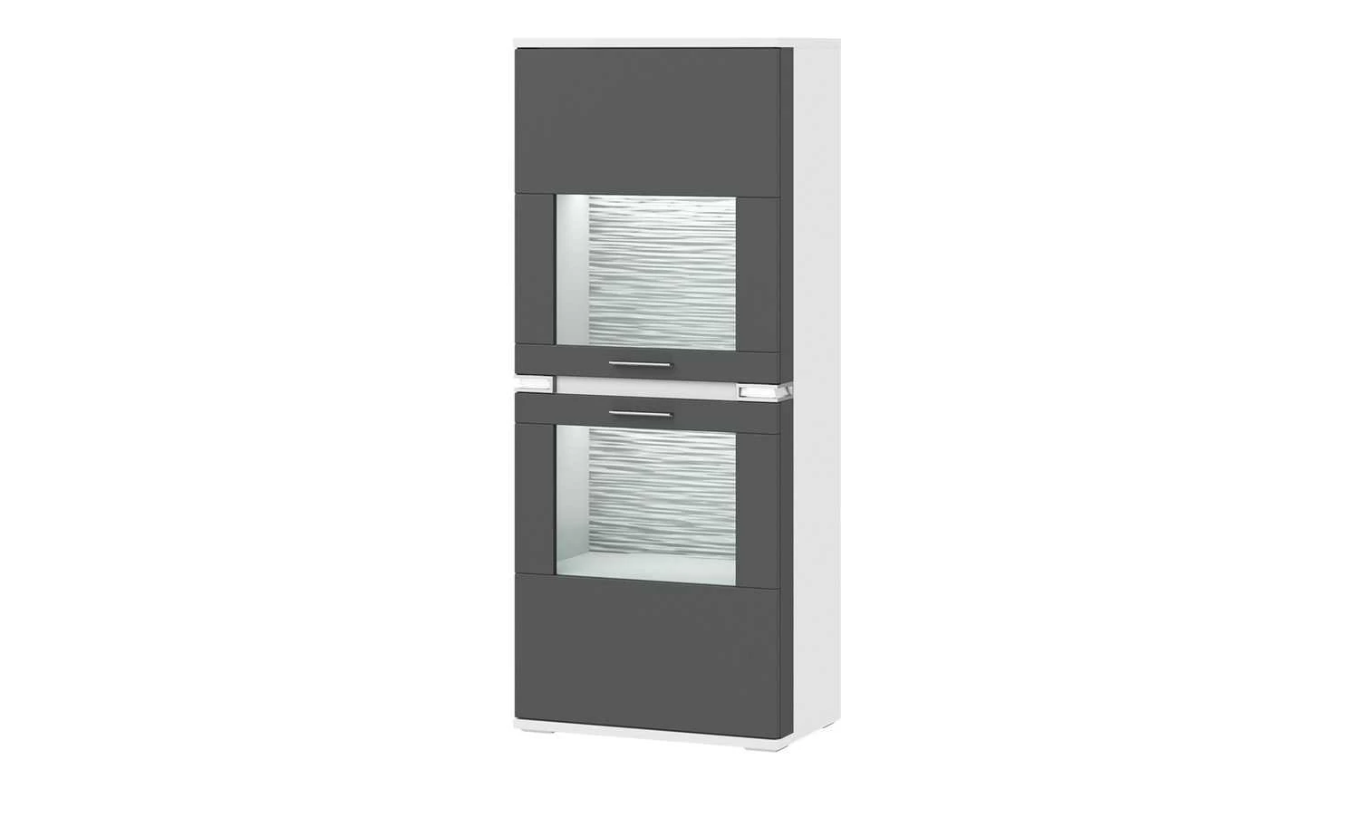 Schönes Geschirr sollte auch gezeigt werden – und das nicht nur beim Essen. Da bietet sich die Vitrine Katt von uno an. Im Inneren können Sie das Porzellan aufbewahren. Durch die Glasabsetzung in der Tür ist es gut zu sehen und gleichzeitig vor Staub geschützt. Die Rückwand der Vitrinenfächer ist farblich von der Front abgesetzt. Damit die guten Stücke innen gut zur Geltung kommen. Ein Eyecatcher ist die Front mit ihrer graphitgrauen Hochglanzoptik. Die LED-Beleuchtung an den Seiten der Front setzt zusätzliche Akzente.