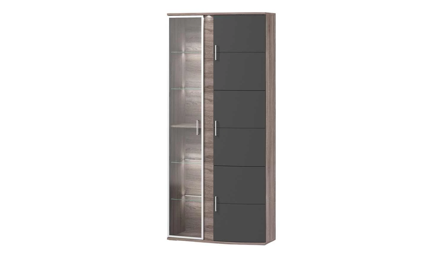 Die Vitrine Onyx von uno bietet zweigeteilten Stauraum. Eine Seite ist mit Glas abgesetzt und einsehbar. Die andere Seite verfügt über nicht einsehbaren Stauraum. Pro Seite sind sechs geräumige Fächer zu finden, die Sie vielseitig nutzen können. Die Vitrinenfächer sind zum Beispiel super, um Porzellan oder dekorative Accessoires zu präsentieren. Onyx ist größtenteils in einem attraktiven Holzdekor (Nachbildung) designt. Die Optik wird mittig an der Front aufgegriffen, hier allerdings mit einer geriffelten Oberfläche. Der Rest der Front setzt sich in Klarglas mit Alurahmen und in Graphitgrau ab. Die Farbe kommt dank der Hochglanzoberfläche noch besser zur Geltung. Eine Frontbeleuchtung setzt zusätzliche Akzente.