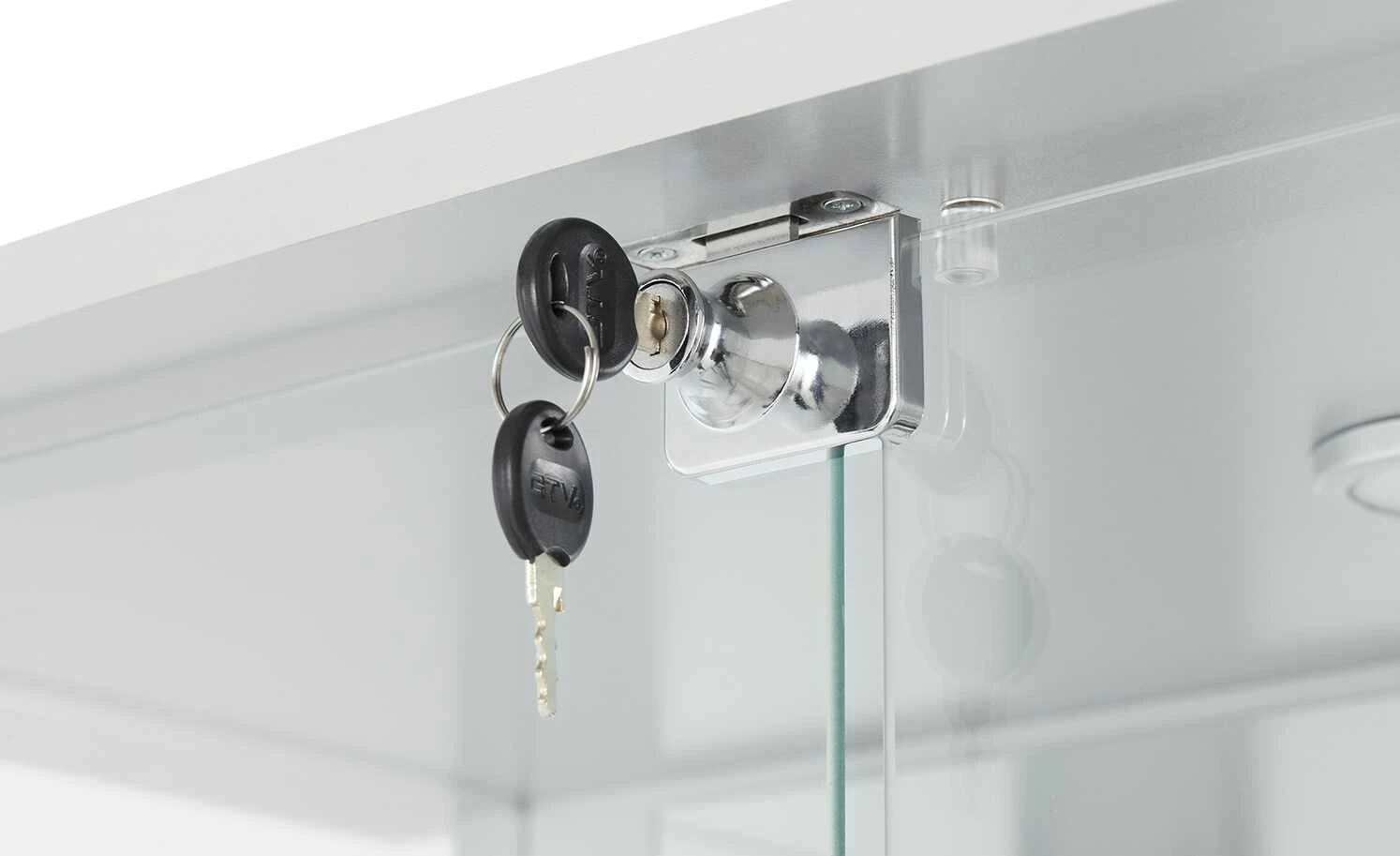 - Mehr zur Ausführung: Belastbar je Einlegeboden: 5kg, inklusive Vitrinenschloss
