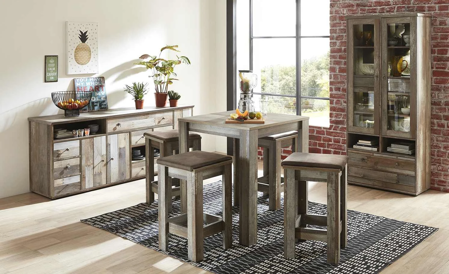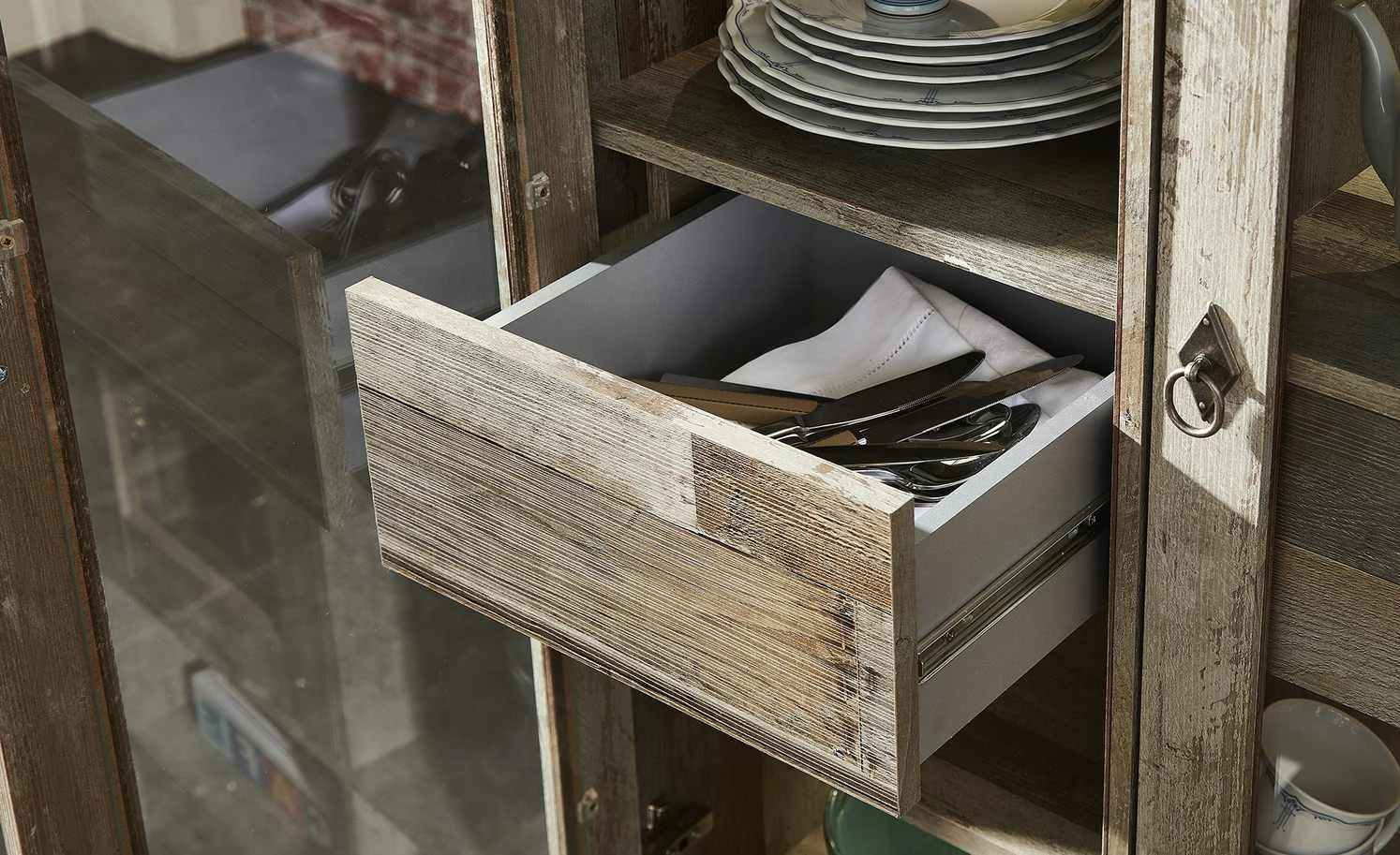 - Ausführung: Korpus und Fronten Treibholz-Optik, diverse Griff-Designs in Antik-Optik